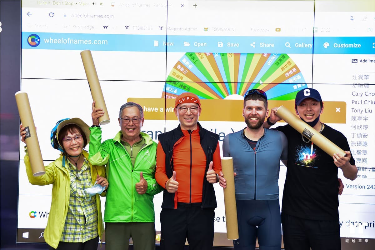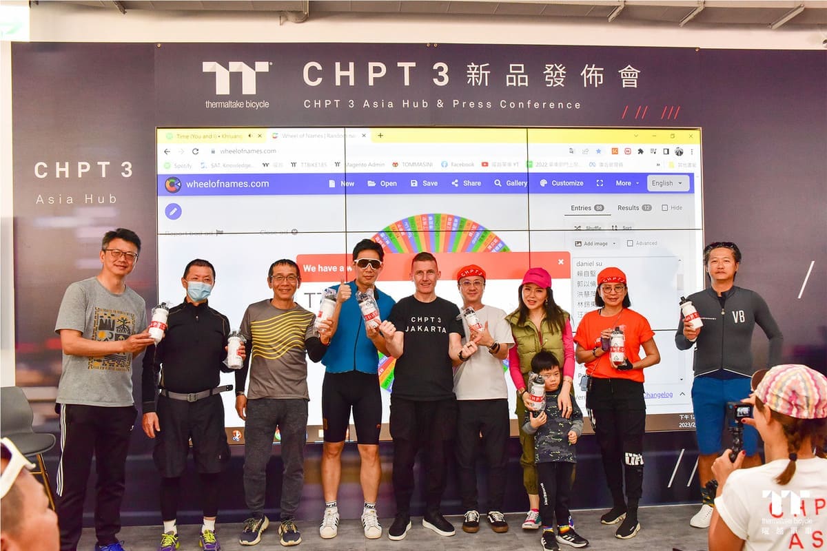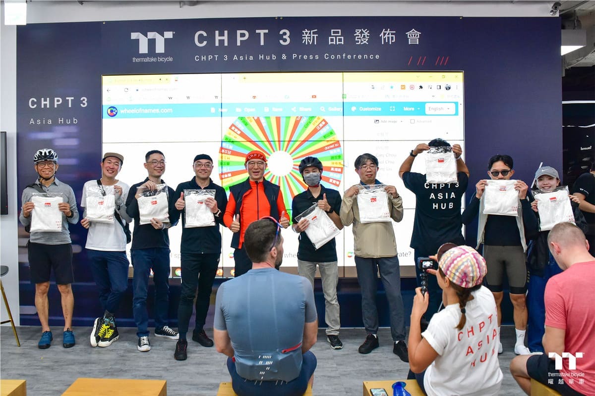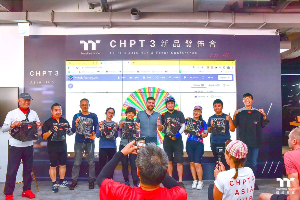 最後,當然還有大家最期待的抽獎環節,抽獎的獎品除了CHPT3 Asia Hub的限量水瓶,同樣限量的CHPT3 Asia Hub T-shirt,竟然還有傳奇車手CHPT3創辦人David Millar親筆簽名的海報,現場由Frank,James及曜越集團董事長 Kenny 一起抽出所有的幸運兒,我們恭喜所有中獎的布友!