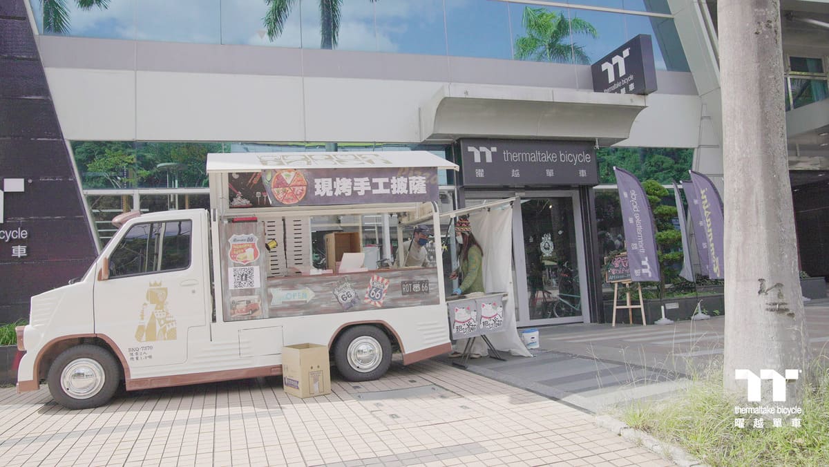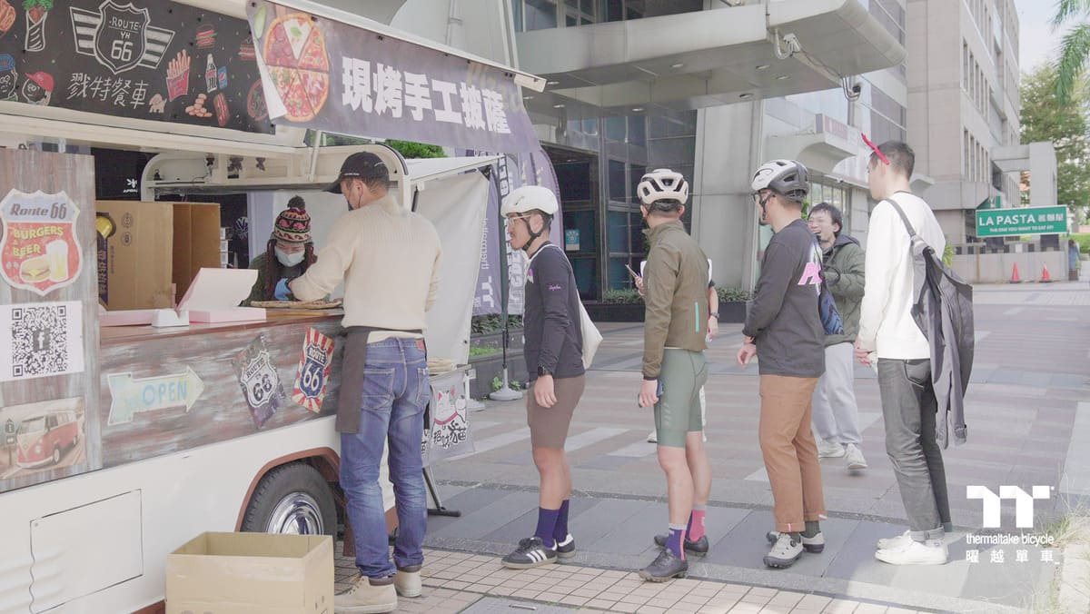 稍作休憩後便踏上回程的路途,回到曜越單車旗艦館後,想必大家都需要補充能量,在旗艦館有著胖卡餐車提供多種口味的現烤Pizza 與星巴克咖啡茶飲給車友們享用,吃飽喝足的同時還能欣賞沿路上騎乘的照片回顧,以及精采的鋼管車/小布改裝裝備品牌 JK